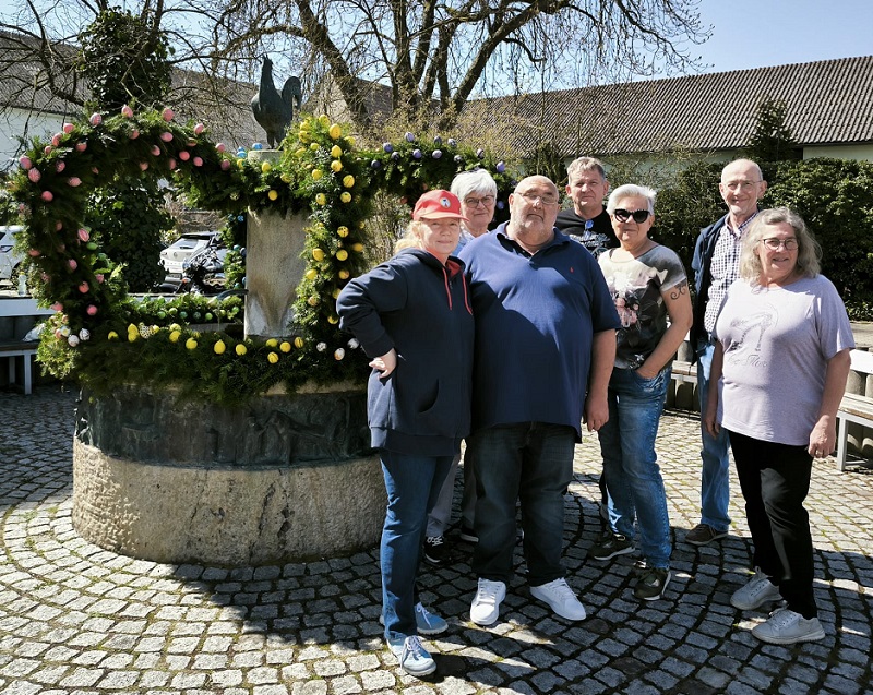 Am Samstag, den 12.4.2025 durften wir wieder den Osterbrunnen vor dem Rathaus schmücken. Diesmal wurde die Krone mit Fichten- und Eibenzweigen umflochten (anstatt bisher Buchs) - sieht auch sehr schön aus!